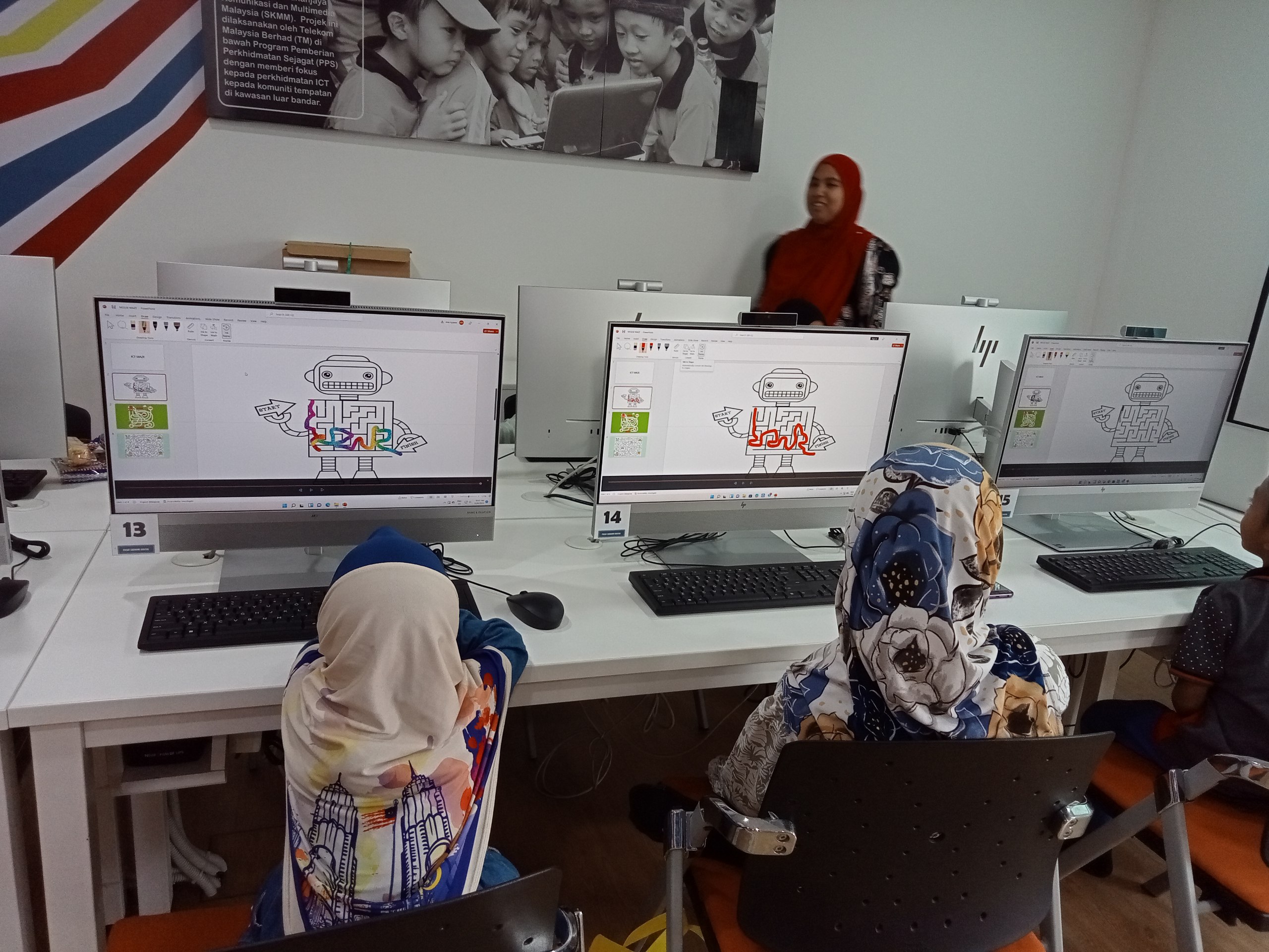 Aktiviti : Menggunakan tab “Draw” untuk melakar laluan melalui labirin membantu peserta meningkatkan kemahiran motor halus mereka, terutama dalam kawalan tangan dan ketepatan.